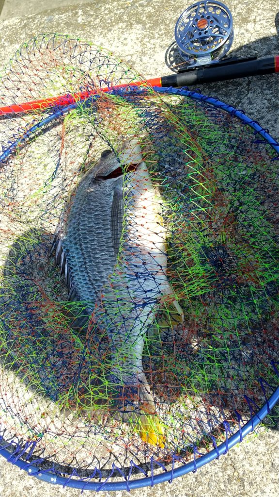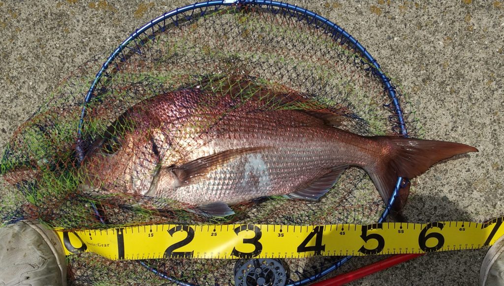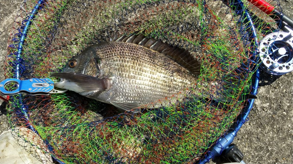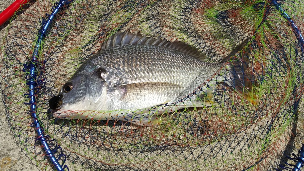 ぼんやり赤い姿が見えてきたので「カンダイか!」と期待が膨らむ。もう少し慎重に頑張り、苦戦しながらタモ入れ成功。