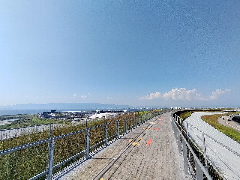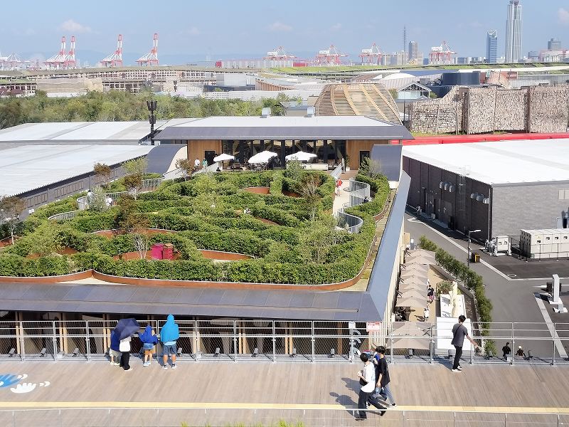 大屋根リングから何か垣根の迷路のような屋上が見える