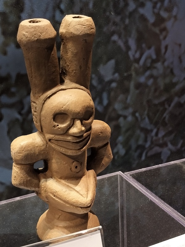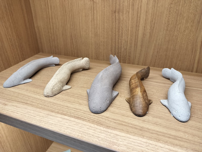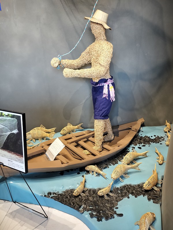 竹?わら?何かで編み込まれて作られた人と魚が展示されている