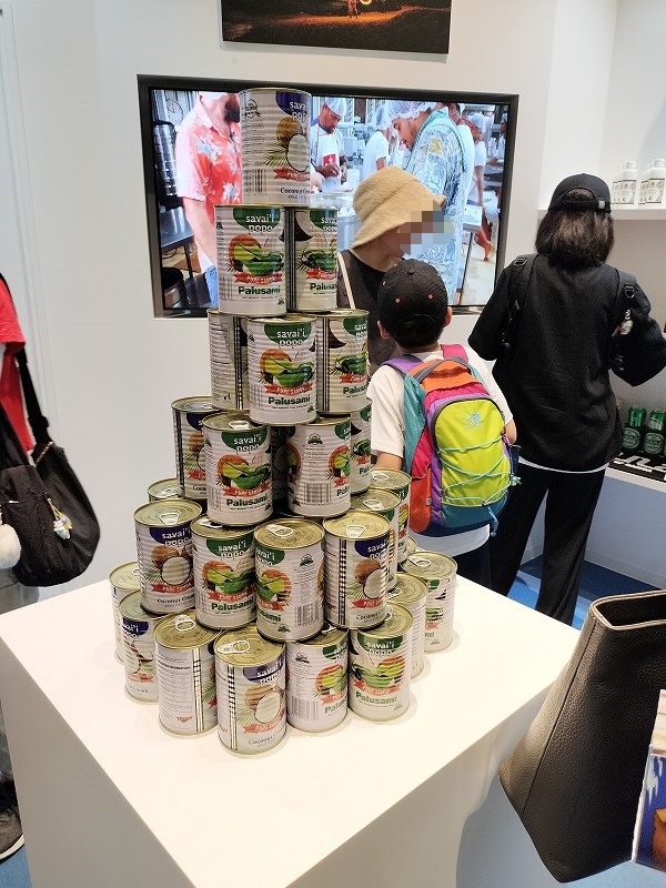 サモアのパビリオン、ココナッツ缶も積み上げられるとカッコイイ
